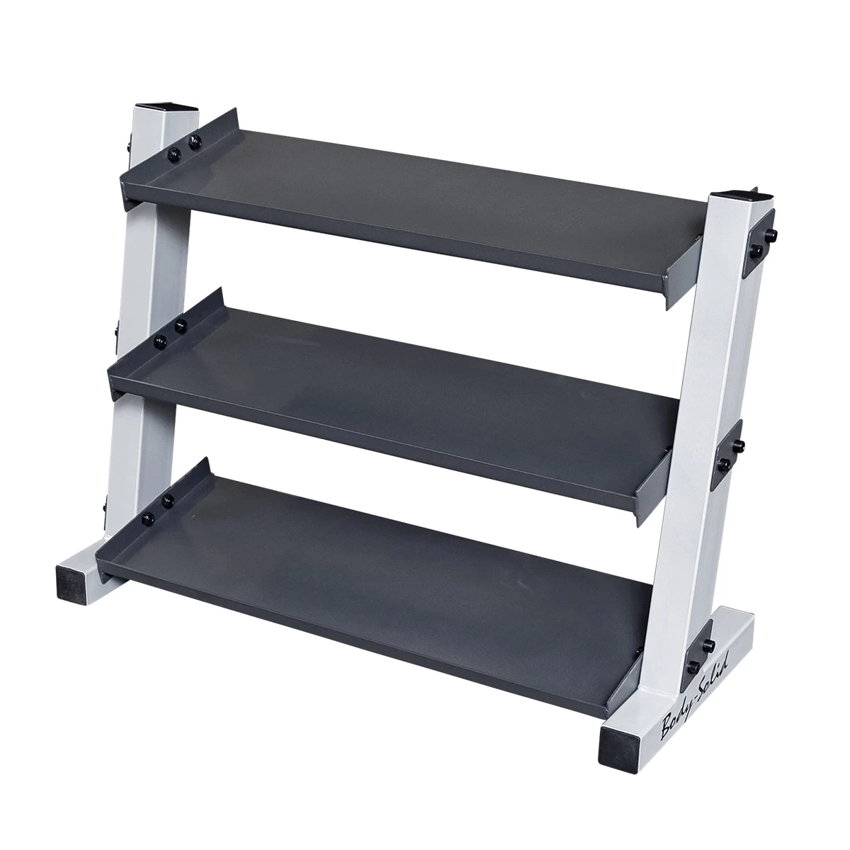 Het Body-Solid GDR34 halterrek is vakkundig ontworpen om 12 paar vinyl of neopreen halters (0,5-7 kg) op te bergen.