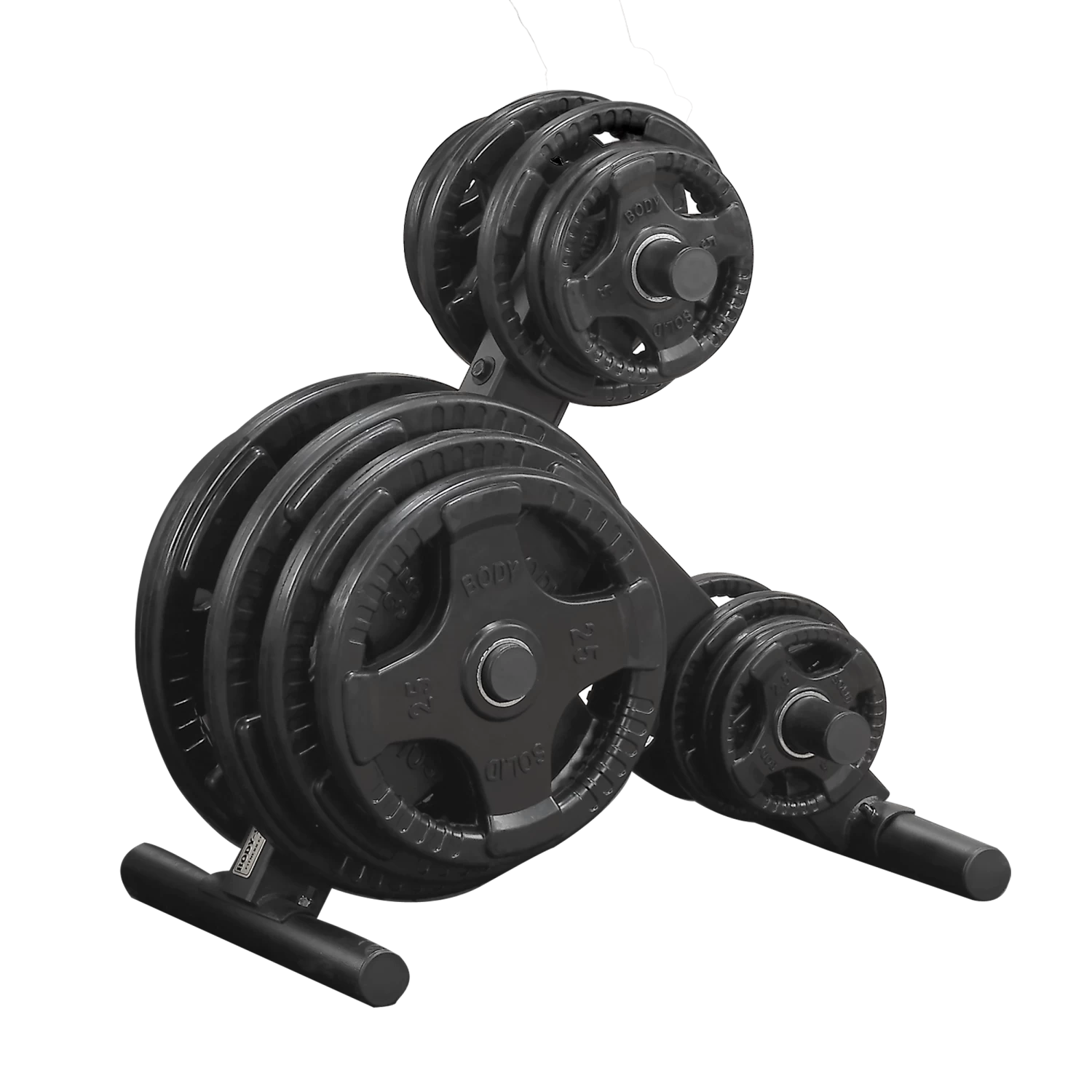 De Olympic Plate Tree van Body-Solid, met een maximale capaciteit van 450 kg en 6 gewichthoorns, is meer dan voldoende om aan deze eisen te voldoen.