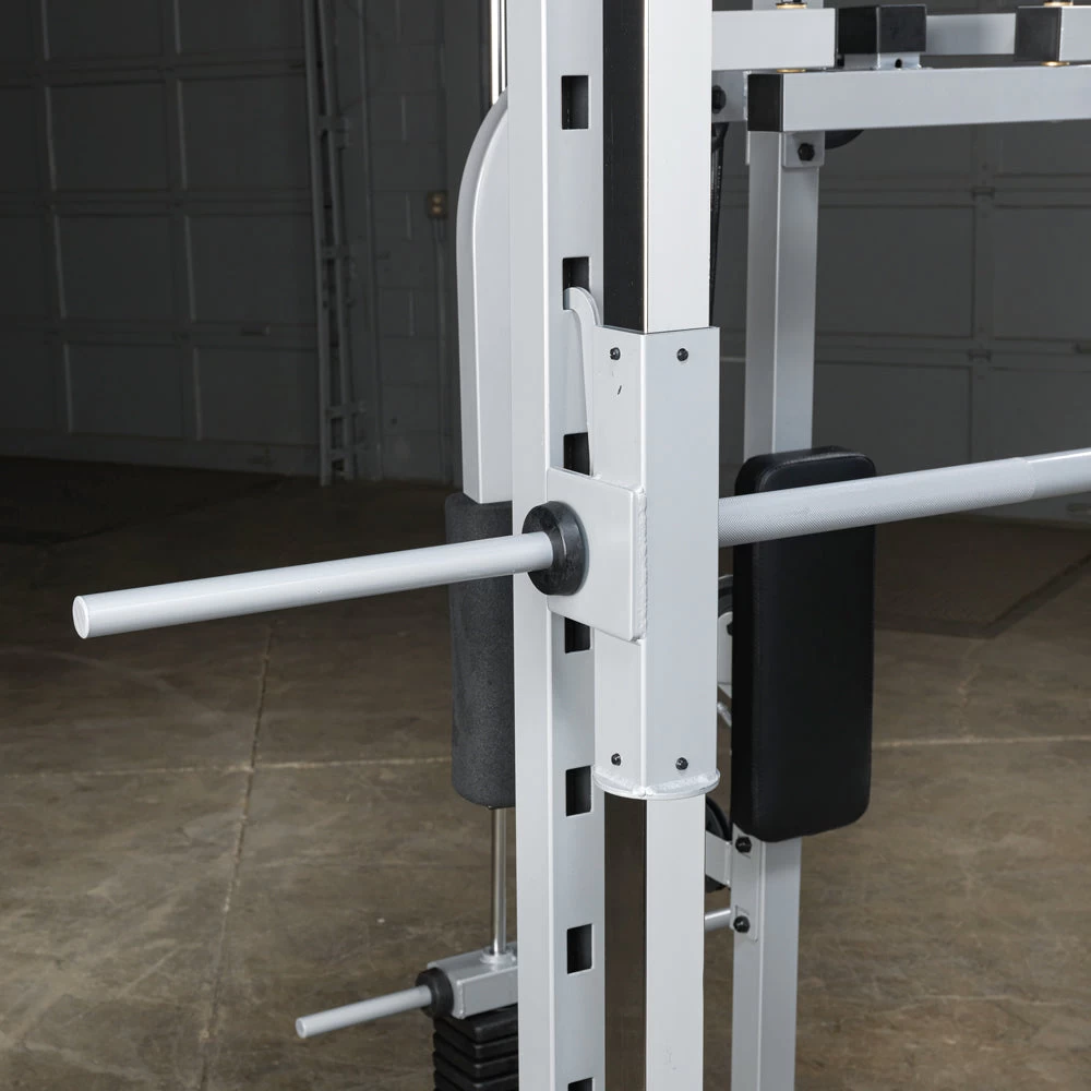 Het frame van deze Smith Machine is zeer stevig en samen met het gepatenteerde ‘Super-Glide’-systeem voorziet dit toestel je van het juiste comfort, zelfs tijdens de meest zware training. De vaste halterstang is voorzien van 14 verschillende vergrendelposities en verstelbare begrenzers om je de ultieme veiligheid te geven.