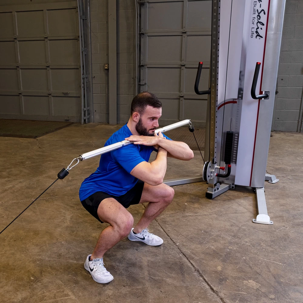 De Body-Solid Aluminum Double Swivel Bar wordt bevestigd aan functionele trainers met dubbele kabels die op beide gewichtstapels worden aangesloten. Hiermee kan je soepele, unilaterale bewegingen uitvoeren.