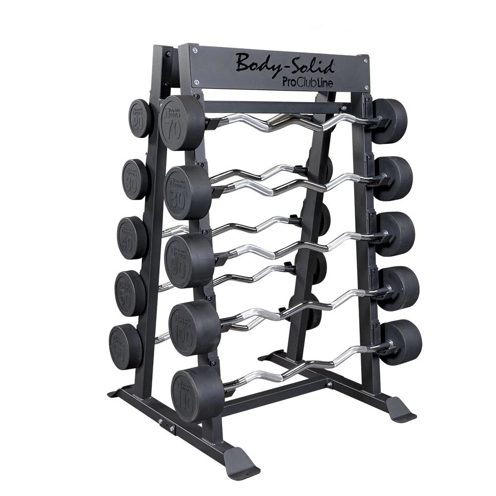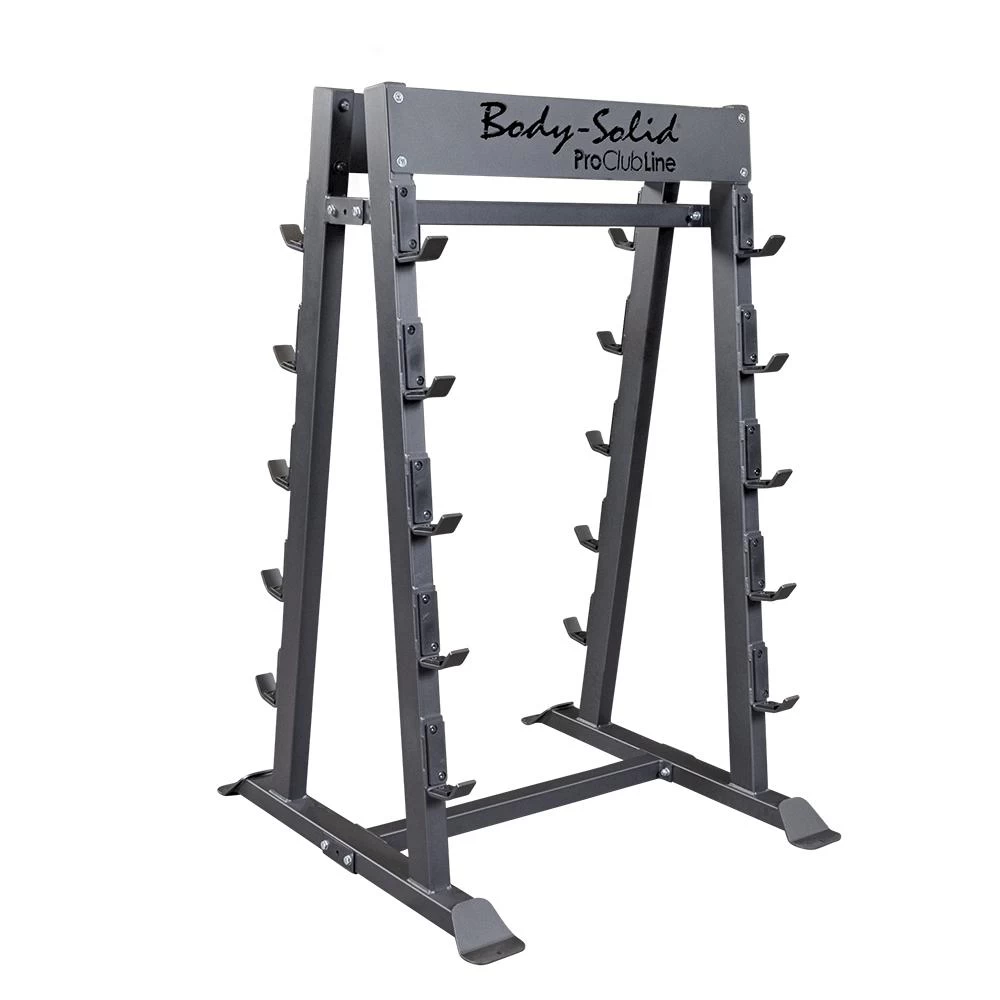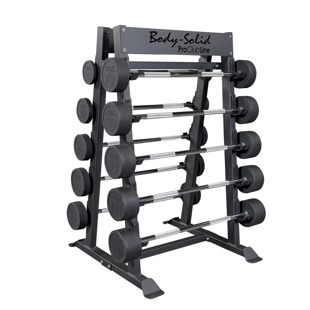 Het Body-Solid Pro Clubline SBBR100 halterrek voorziet in gemakkelijk toegankelijke opslag voor maximaal 10 barbells met rechte en gebogen halterstangen.