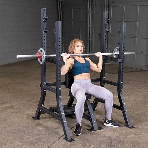 De verstelbare veiligheidsstops en het geïntegreerde spotterplatform zorgen voor maximale veiligheid tijdens het zwaar tillen. Meerdere lift-off en racking posities stellen elke gebruiker in staat om veilige en effectieve shoulder press bewegingen uit te voeren.