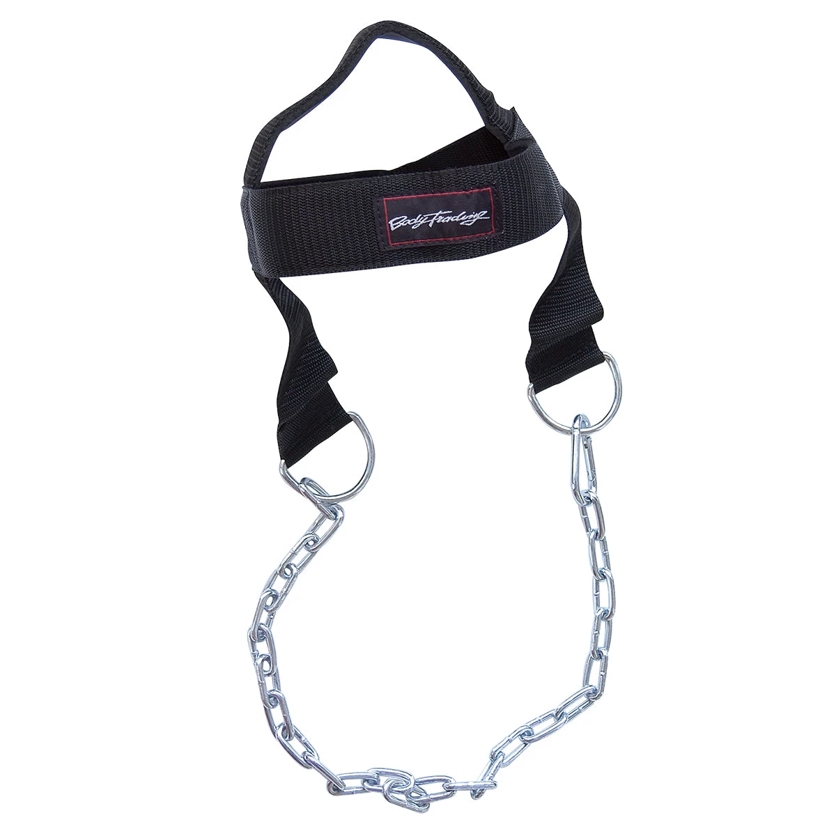 Door te trainen met dit hoofdharnas zullen je nek en bovenste rugspieren aanzienlijk versterkt worden. De zwaar uitgevoerde stalen ketting is voorzien van extra-D-ringen en het harnas heeft een vulling van neopreen voor het absorberen van schokken om letstels te voorkomen. Je kan het bebruiken in combinatie met halterschijven of bevestigen op een homegym/station.
