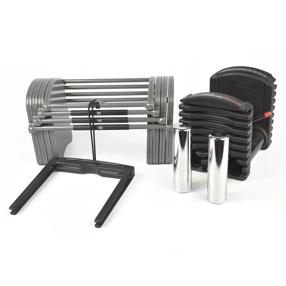 Een PowerBlock bestaat uit een aantal onderdelen die in elkaar passen, elk met een zwaarder gewicht. Deze worden aan elkaar geklikt met een zware dubbele pin. Deze pin wordt met een sterk elastiek aan het handvat van het middelste deel van de gewichten bevestigd. Je schuift de pin tussen de gewichten om een bepaald gewicht te selecteren en bevestigt deze aan het handvat. Vervolgens til je het gekozen gewicht op met de gewichtsgreep en je kunt beginnen met je oefeningen. Zo gemakkelijk kan een oefening zijn!