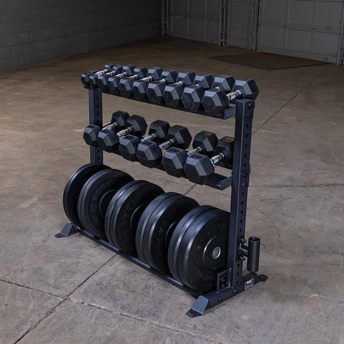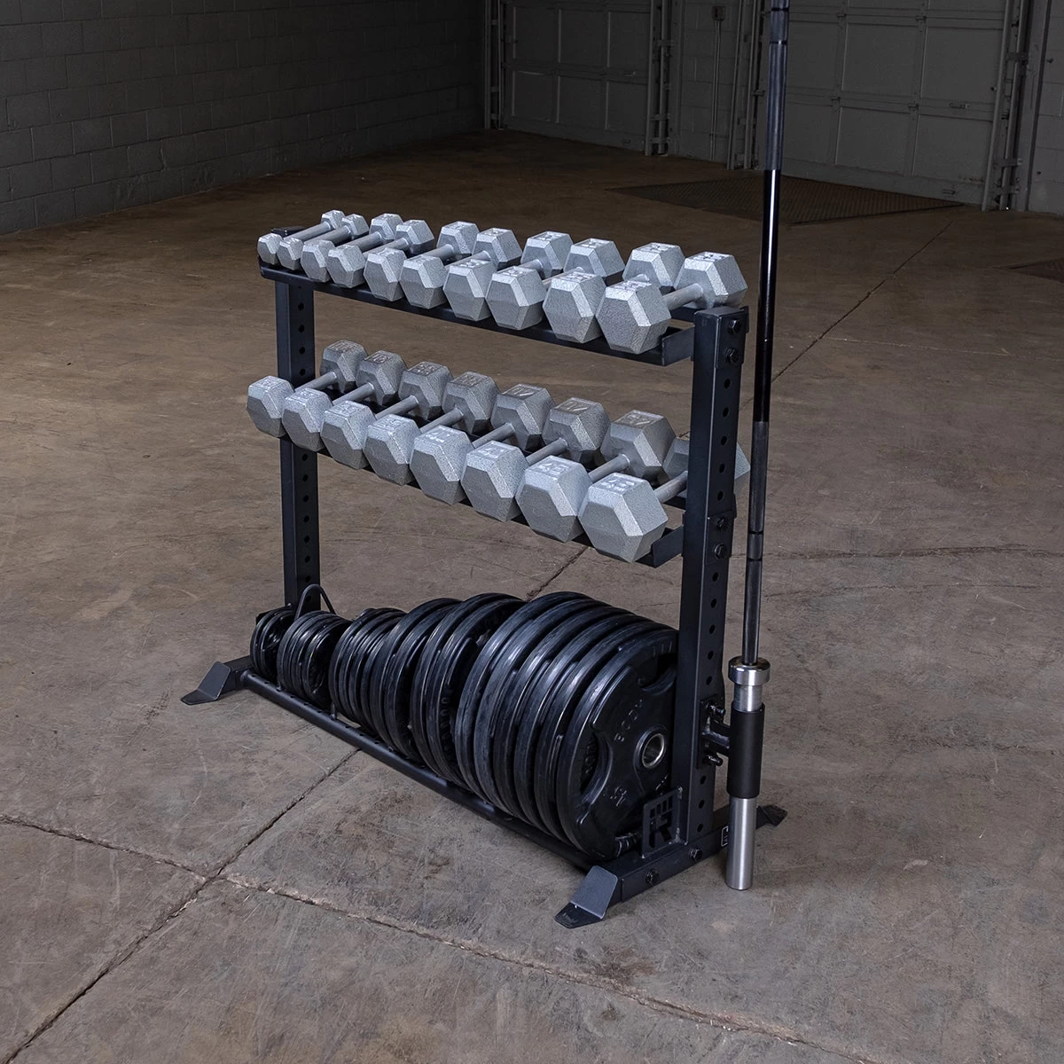 Op dit rek kan je halters op de twee verstelbare haltertrays plaatsen, terwijl bumper- en halterschijven comfortabel op de bodem van het rek passen. Inclusief stanghouder aan de zijkant.