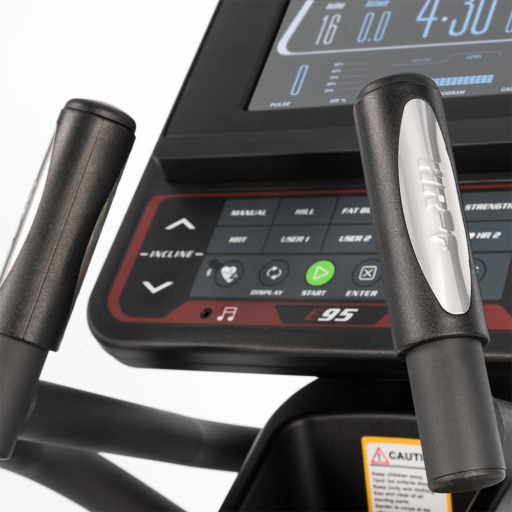 Wat de Sole E95 uniek maakt ten opzichte van andere crosstrainers op de markt is de elektronisch verstelbare hellingshoek. Deze “power incline” functie biedt extra weerstand en variabele posities waardoor je je kan richten op de belangrijkste spiergroepen van het onderlichaam, terwijl de scharnierende handgrepen het bovenlichaam trainen. Gebruik de bijgeleverde draadloze borstband of de ingebouwde hartslagmeter in de handgrepen om je hartslag tijdens de training te controleren. Zowel de weerstand als de hellingshoek zijn aan te passen met de ingebouwde knoppen in beide handgrepen. Zo kan je trainen zonder de handgrepen los te laten.