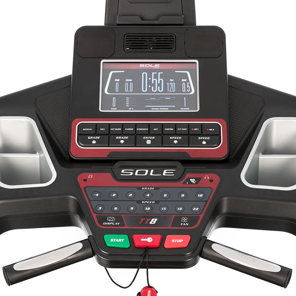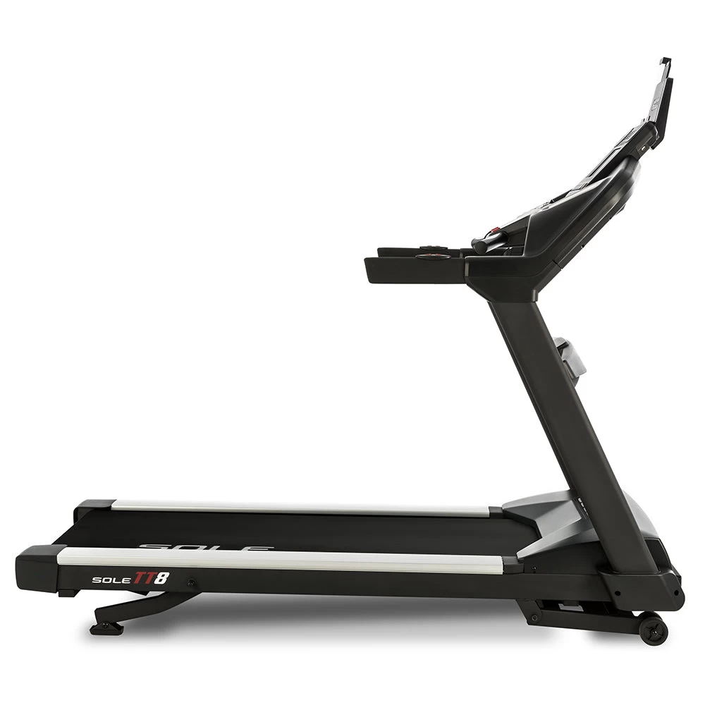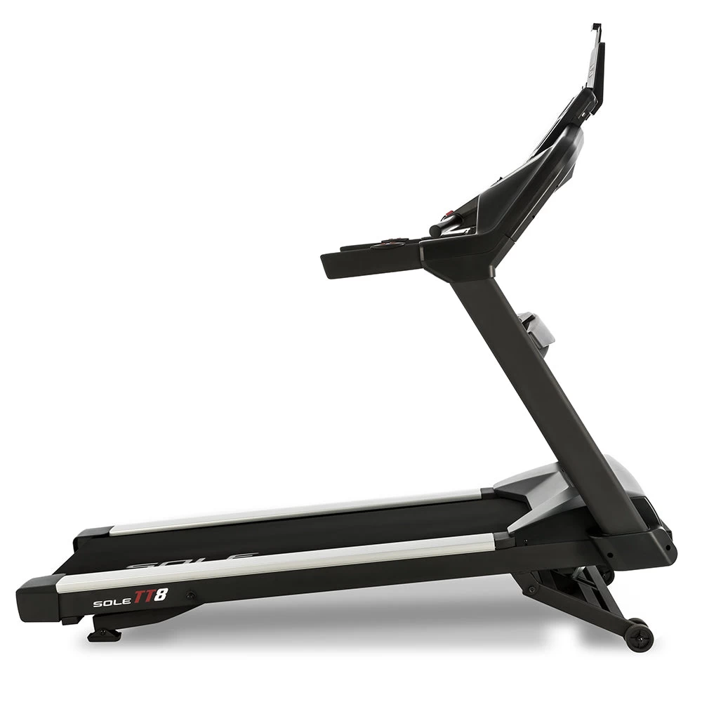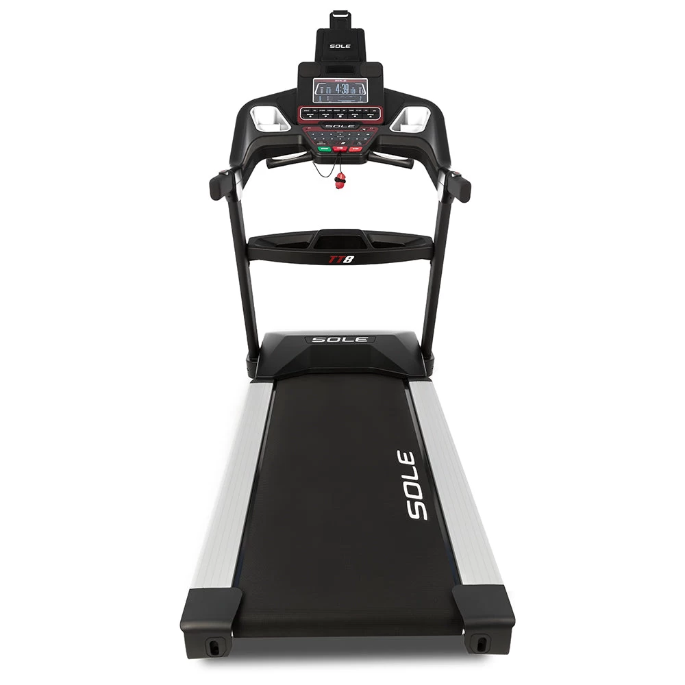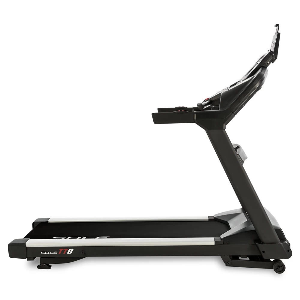 De SOLE TT8 loopband biedt een compromisloze kwaliteit die jarenlang meegaat en presteert op hetzelfde niveau als duurdere commerciële modellen. De TT8 heeft een breed loopvlak, een verstevigd stalen frame en is geschikt voor gebruikers tot 165 kg. Met deze loopband kunt u zowel helling op lopen (15 niveaus) als helling af lopen (6 niveaus).