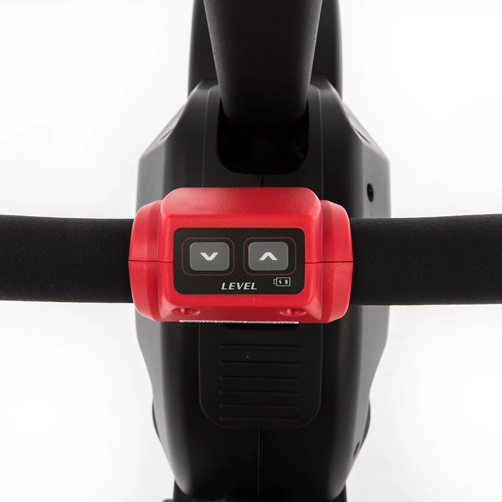 De weerstand wordt zowel door lucht als een magneet geregeld en is eenvoudig te verstellen via de ingebouwde bedieningstoetsen in de handgreep.