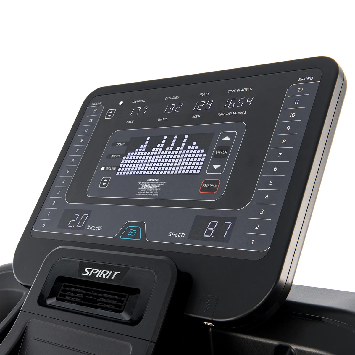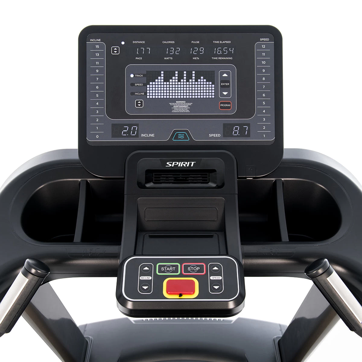 - Unieke kenmerken: USB voor het opladen van apparaten (bevindt zich rechtsonder de console), CSAFE, directe snelheids-/inclinieknoppen, handpulssensoren, hartslagontvanger (borstriem apart verkrijgbaar), koelventilator, dubbel accessoirebakje/bekerhouder, transportwielen